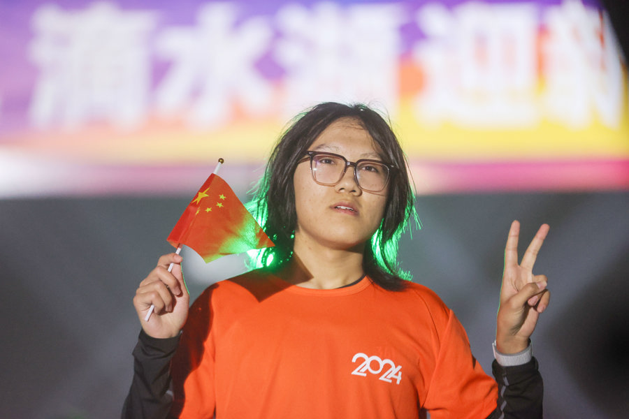 一名选手在终点拍照留影。