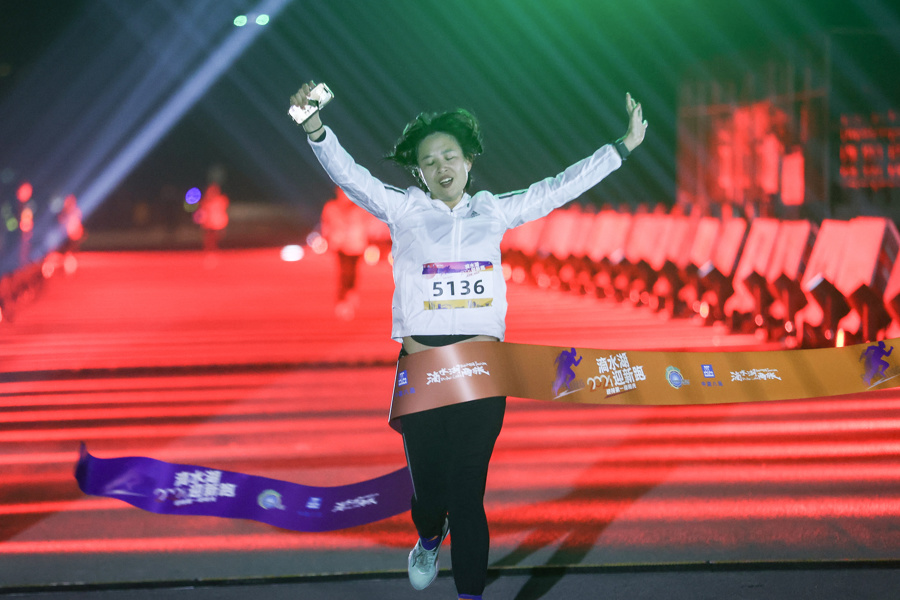 一名女性参赛选手冲向终点。