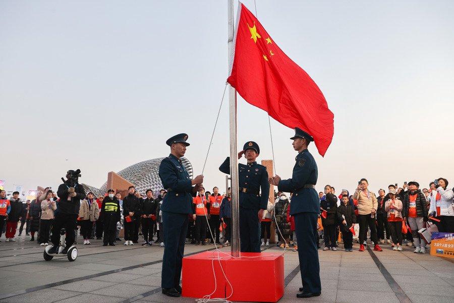 滴水湖举行升旗仪式,迎接新年第一缕阳光。