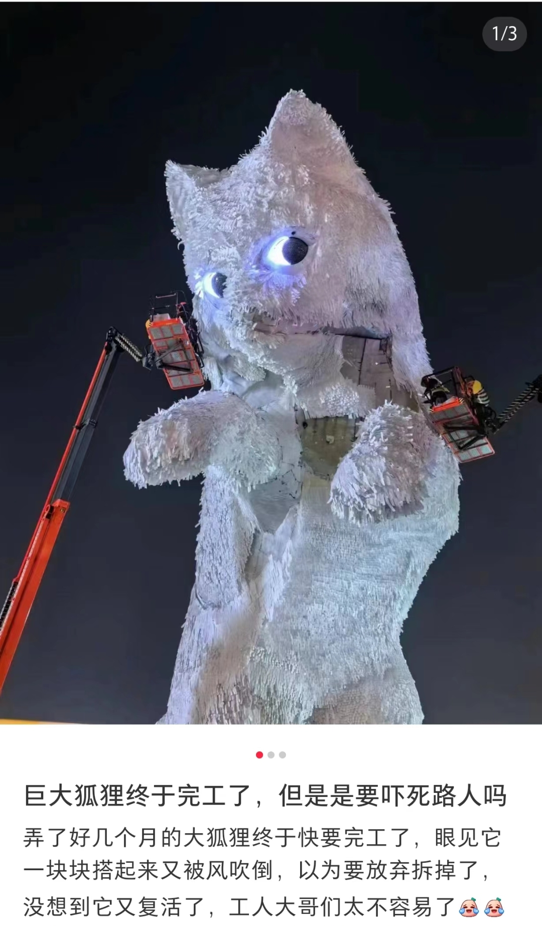 早上憨态可掬、形态逼真的白狐,到了晚上却显得有些可怕,不少路人曾被它吓了一跳。不过,也有网友表示:倒是有冲动想要夜里去看看。