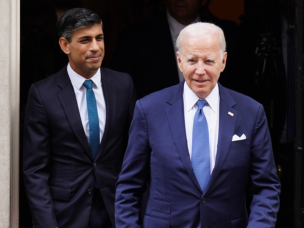 去年7月10日,拜登结束了对英国的访问后,英国首相苏纳克与其告别。图片来源:视觉中国