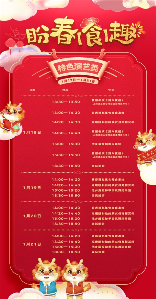 三周的活动将分别围绕“盼春【食】趣”“寻春【戏】趣”“迎春【艺】趣”三个主题展开,每周推出不同主题和内容的特色演艺、互动游艺、手作体验等活动,并计划在1月18日(腊八节)、1月27日(五九)、2月4日(立春)分别推出一场网络直播活动,届时将由人气主播在线导览本次展示体验活动,让更多市民朋友了解年俗文化,喜迎龙年春节,共话传统节庆。