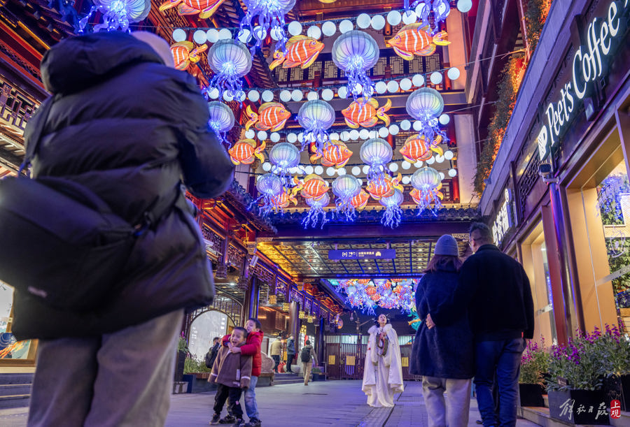 豫园老街被一盏盏龙纹宫灯装点一新,用龙图腾串联起千年的龙文化和现代的审美,宫灯上装饰纹样取自苏州丝绸博物馆馆藏,时光流转间“寻龙逐梦”,历代龙纹逐光随影,渐次呈现。老街二楼连廊高处悬挂云龙,点缀亭台楼阁之间,搭配“寻龙秘境”主题,游人手机AR扫描,即可寻觅到一条隐藏的非遗“刺绣龙”。巨型走马灯旋转,与游客交互的同时,传递出吉祥的美好祝福。