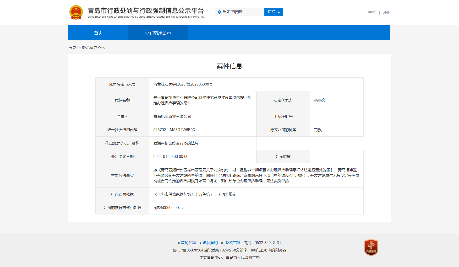 中国质量新闻网讯 青岛市行政处罚与行政强制信息公示平台近日披露,青岛旭博置业有限公司新建住宅开发建设单位未按照规定办理供热手续,被西海岸新区综合行政执法局处罚。