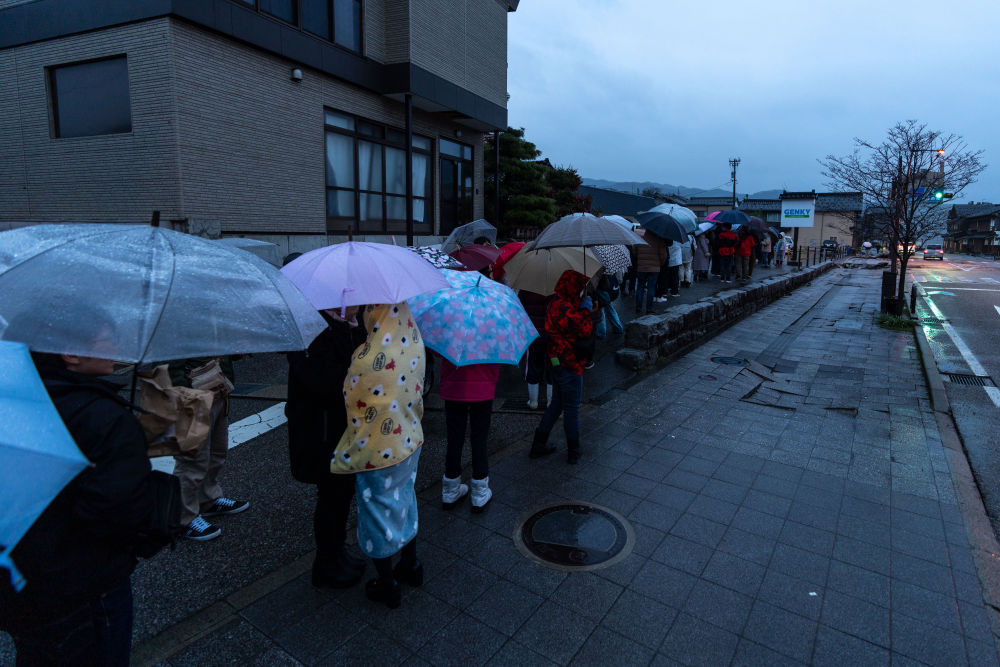 1月3日,在日本石川县轮岛市,市民在一家超市外排队等待采购生活物资。饮用水、方便面及方便米饭等物资限量购买。新华社记者张笑宇摄