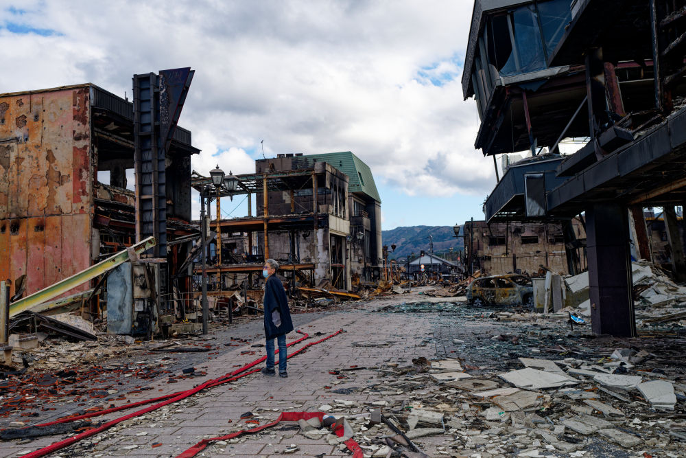 地震发生后,轮岛市著名景点“朝市通”、即早市大街发生大火,过火面积4.8万平方米,烧毁大约200家店铺,包括柴垣善助(音译)经营的漆器店。