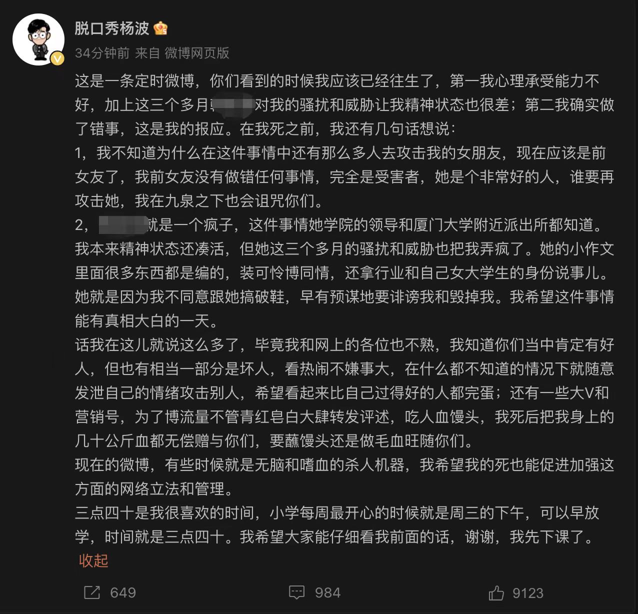 2月4日下午,脱口秀演员杨波在其个人微博发微博称,“这是一条定时微博,你们看到的时候我应该已经往生了,第一我心理承受能力不好;第二我确实做了错事,这是我的报应。”目前,该微博已删。