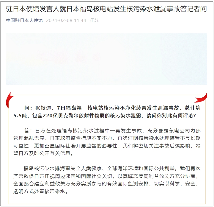 微信公众号“中国驻日本大使馆”2月8日消息,驻日本使馆发言人就日本福岛核电站发生核污染水泄漏事故答记者问。