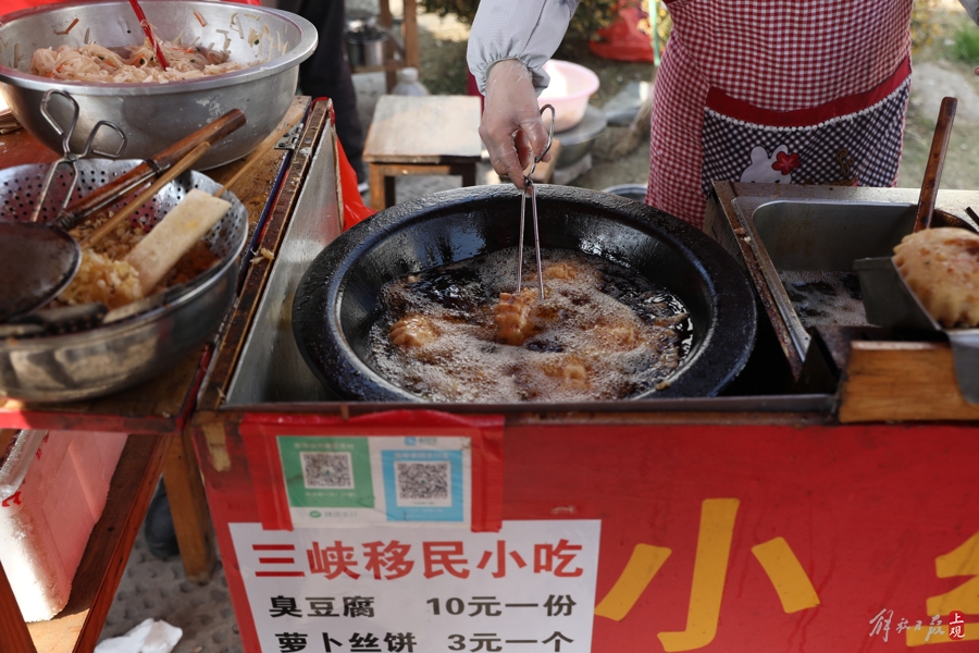 美食摊点前人流汇聚,为古镇营造出浓郁烟火气。