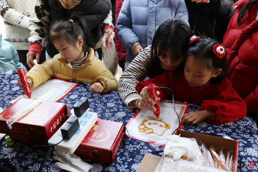 小朋友饶有兴趣在体验非遗糖画。