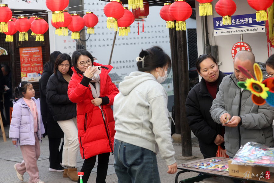 龙年新春,来自沪浙毗邻两地的村民们在金山廊下山塘老街的集市上畅享新年。一排排大红灯笼高高挂起,一个个民俗摊位前人头攒动,将春节的节日氛围装点得分外红火热闹。