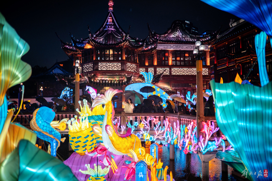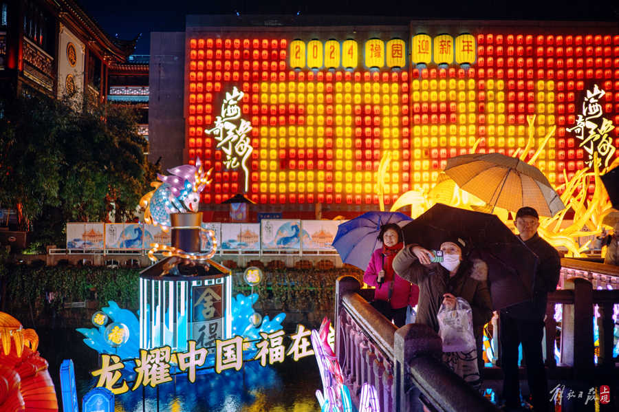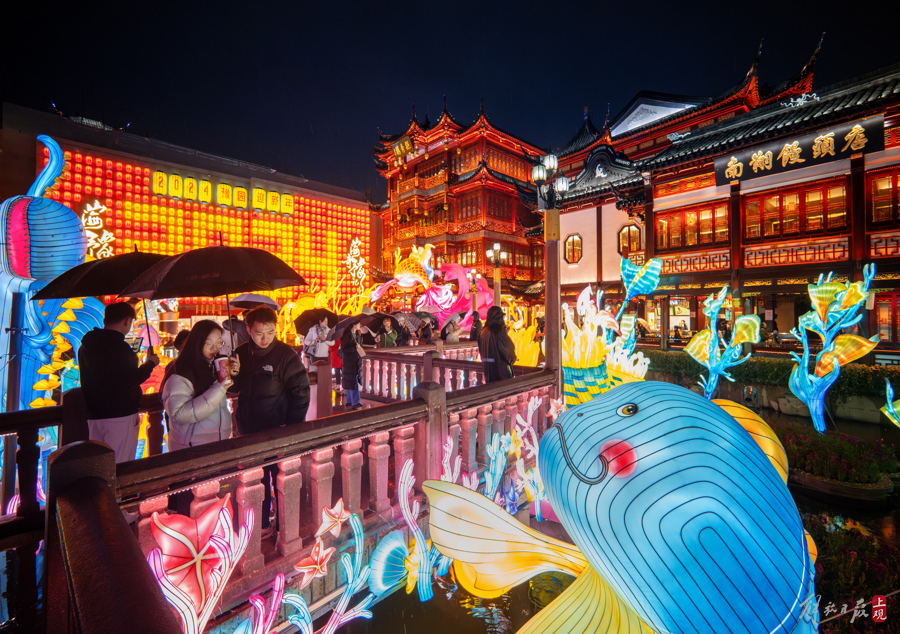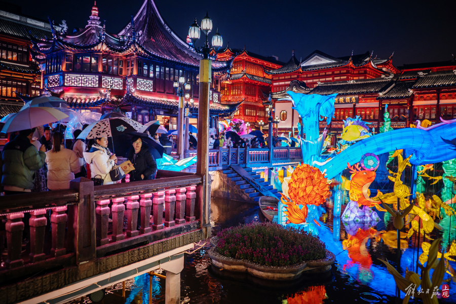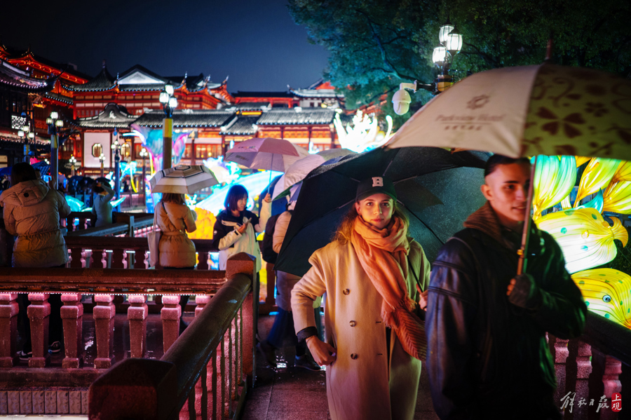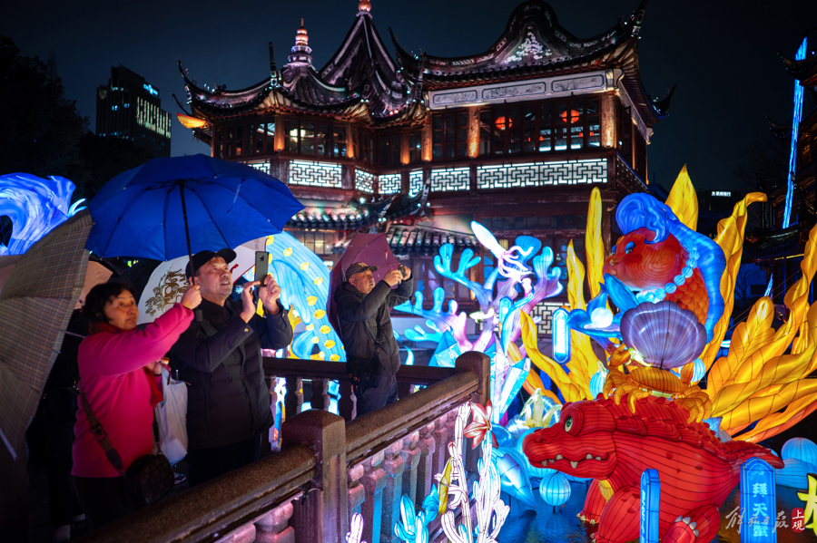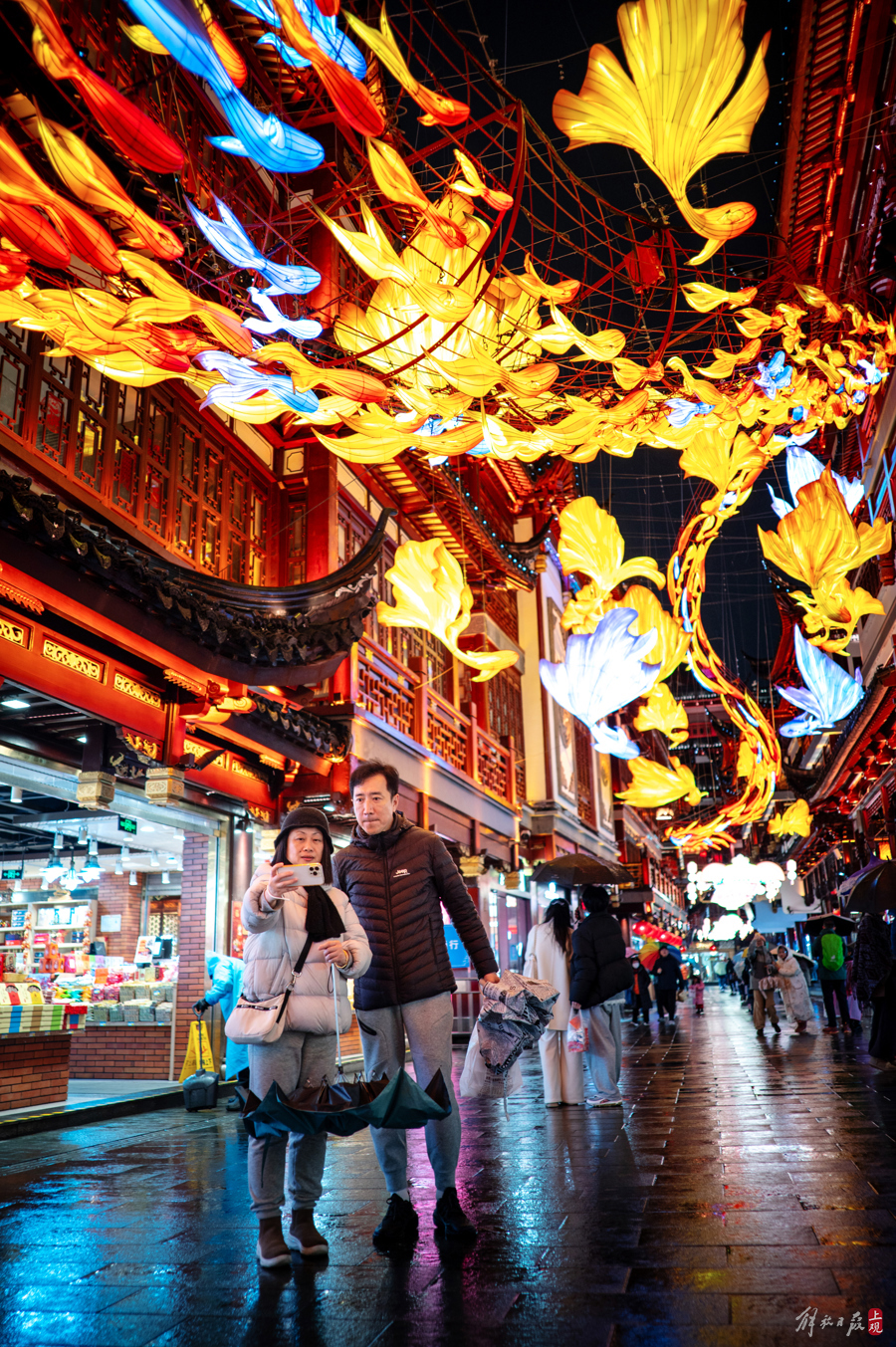 九曲桥上的游客男女老少,天南海北,沉浸式的观灯体验让大家兴奋不已。