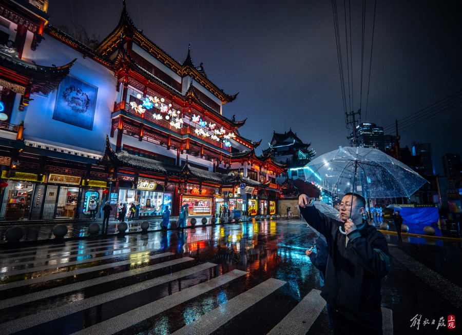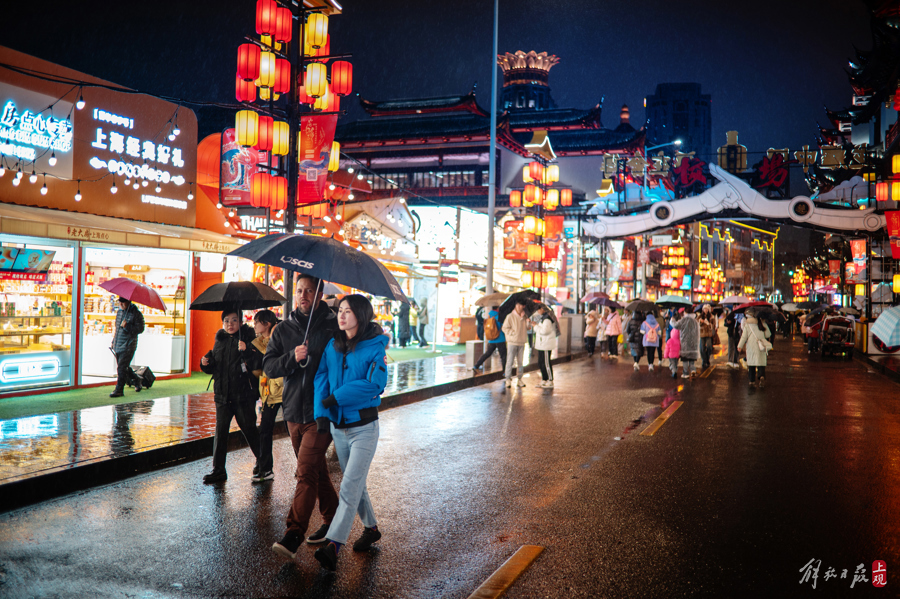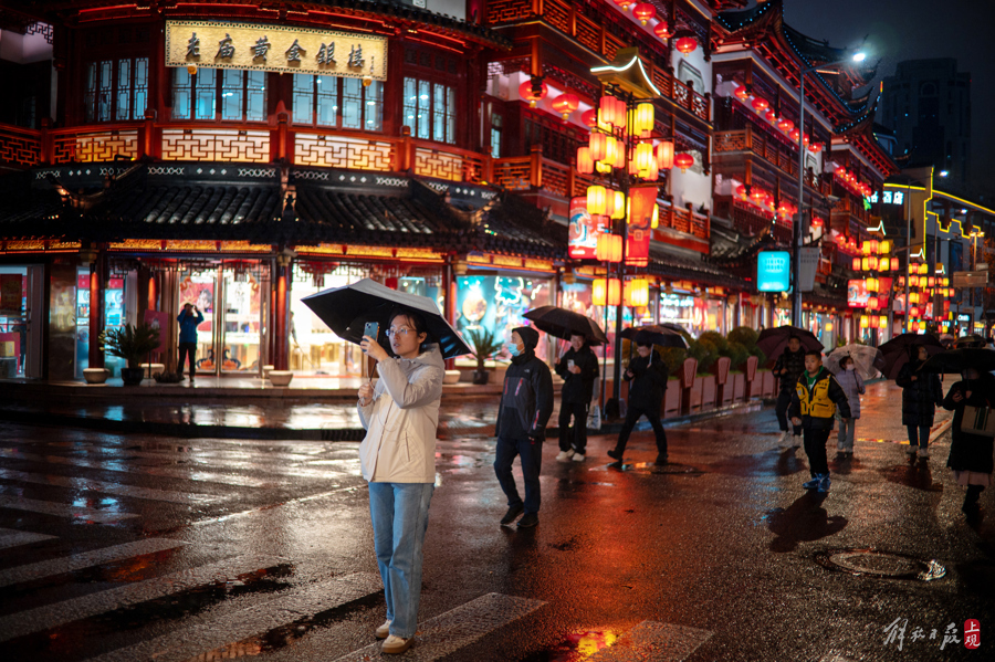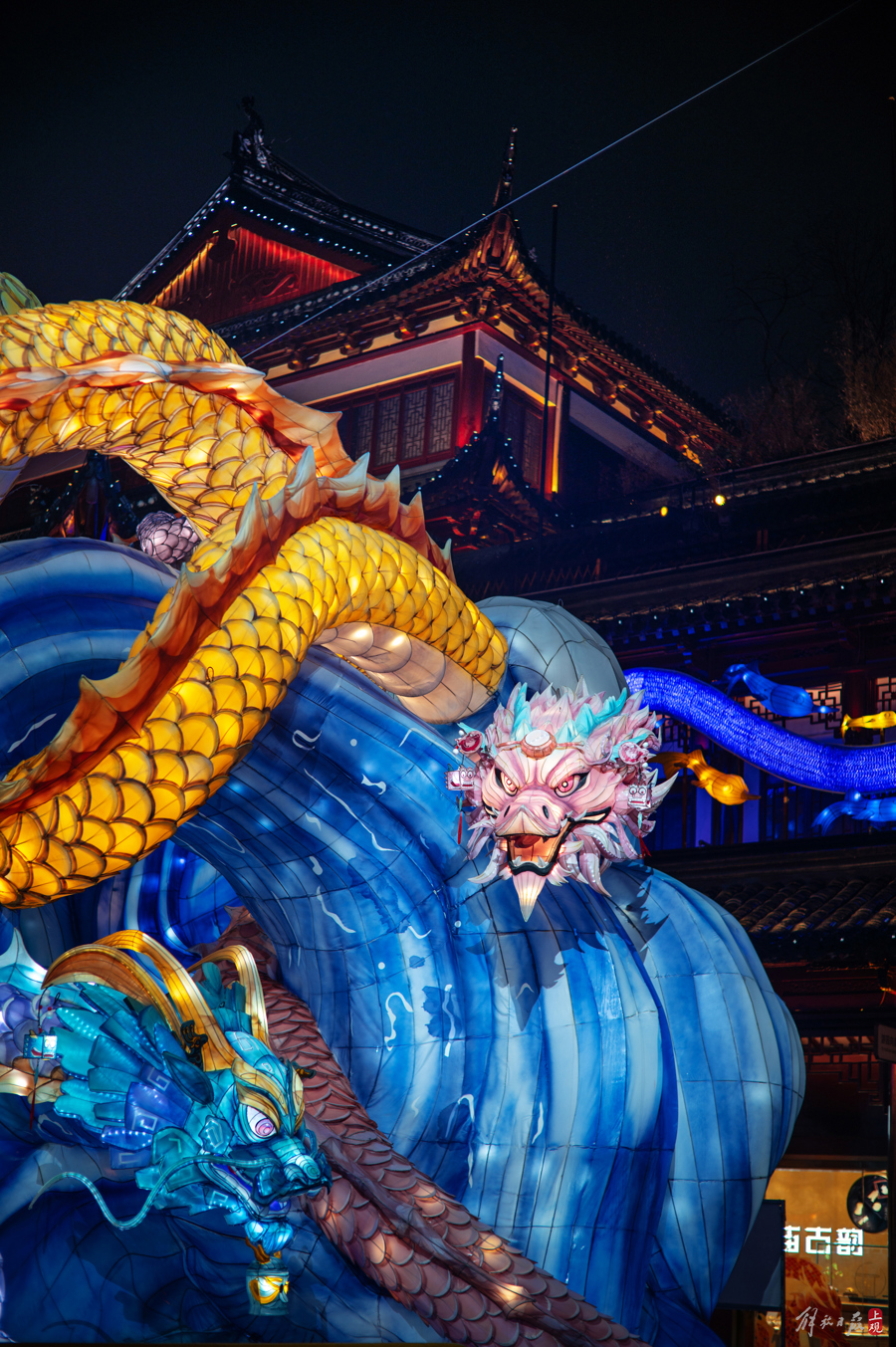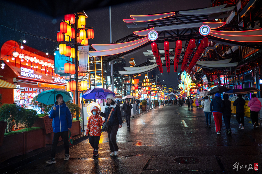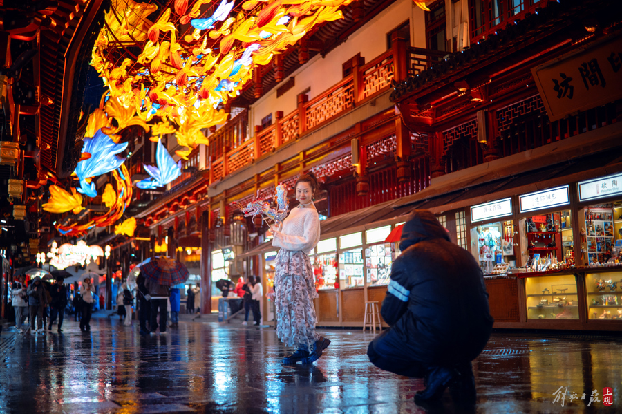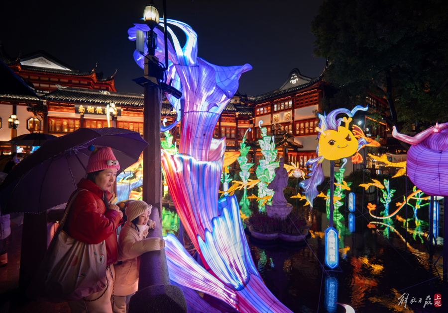 九曲桥上的游客男女老少,天南海北,沉浸式的观灯体验让大家兴奋不已。