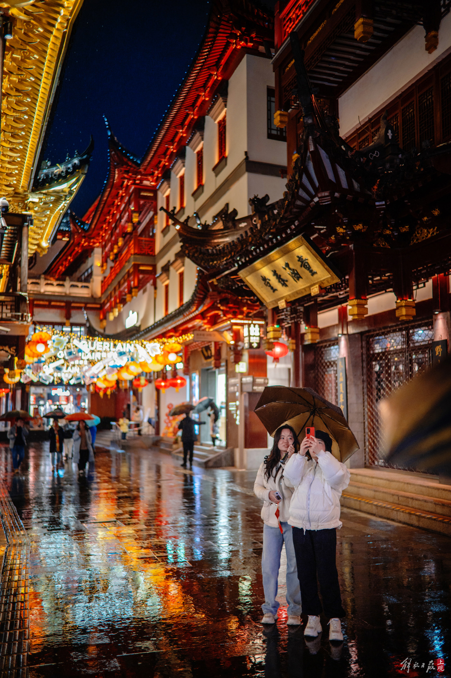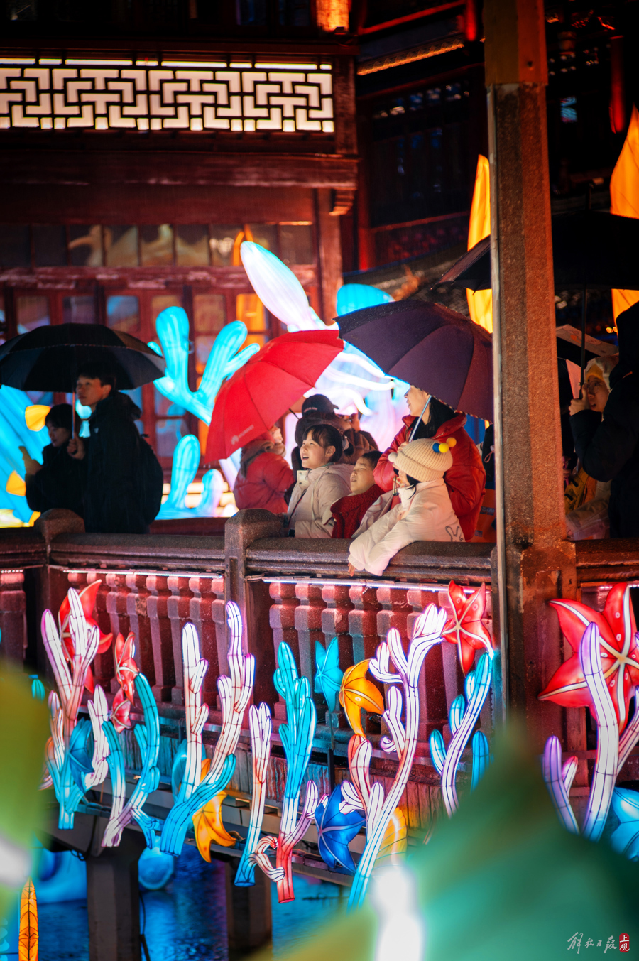 撑一把伞,在绵绵细雨中赏灯观景,地面上积水的反光与高悬的彩灯相映成趣,视觉效果拉满,带来别样的浪漫体验。