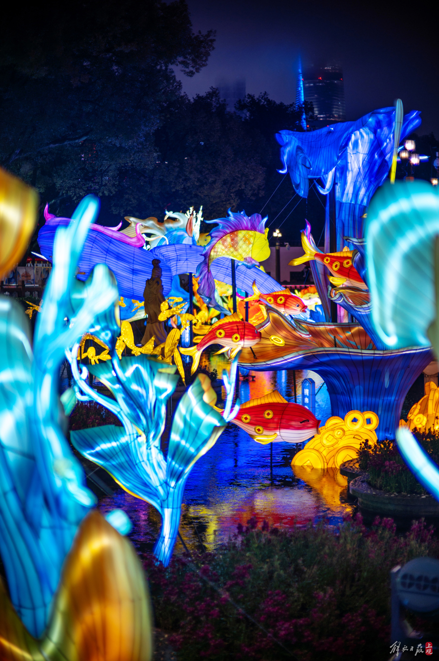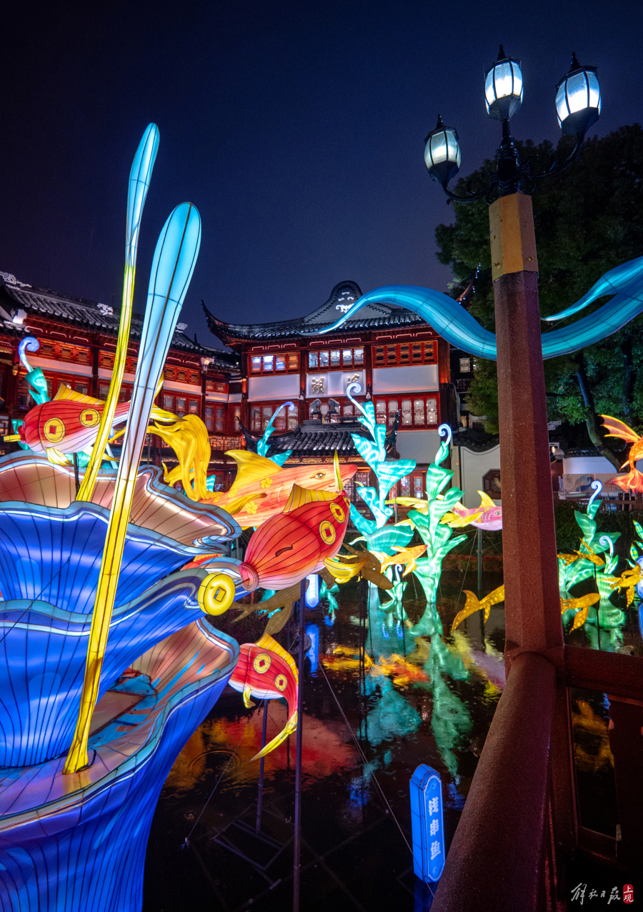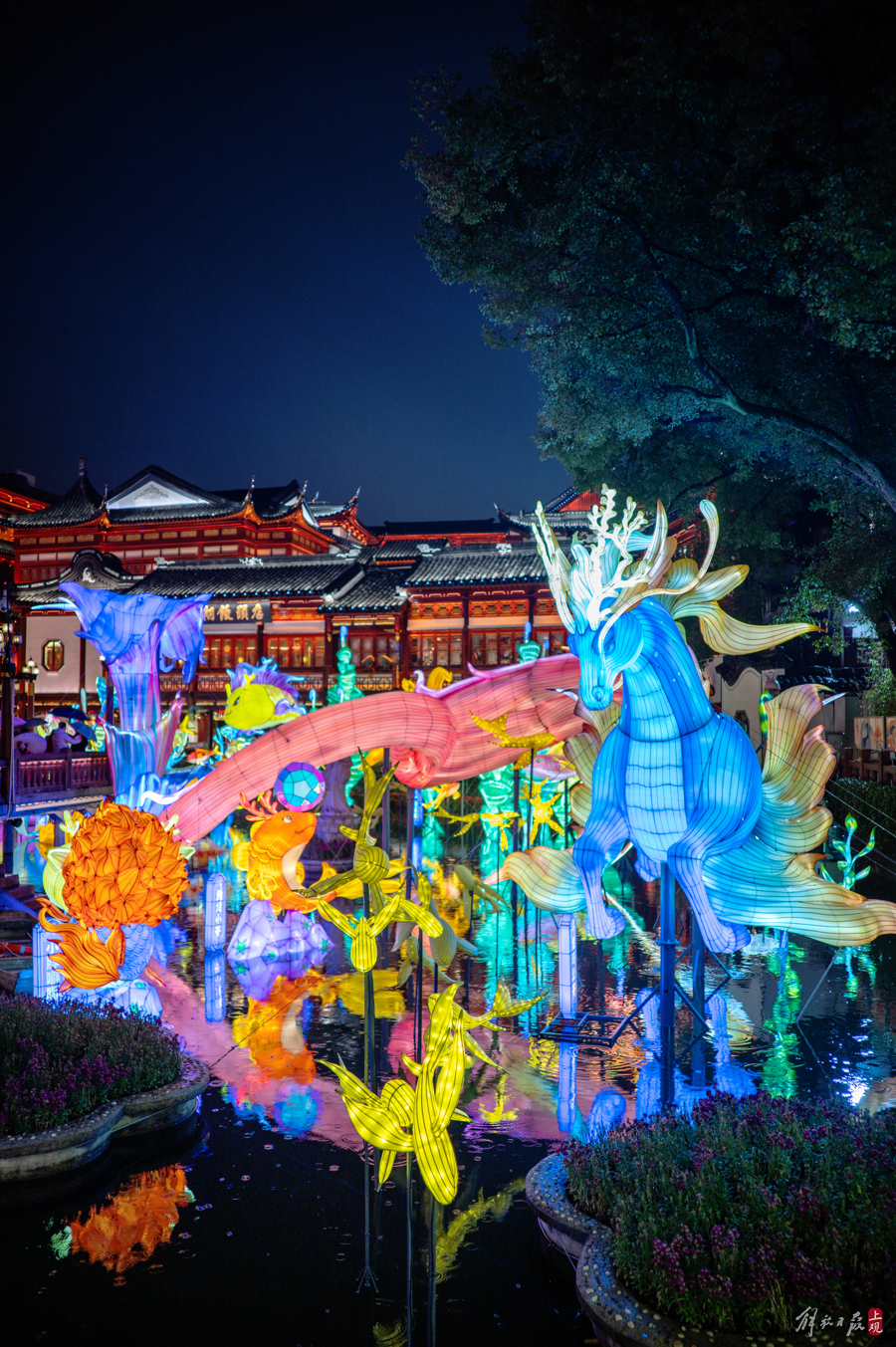 九曲桥赏灯的妙处就在于移步换景,走两步就是全然不同的景观。