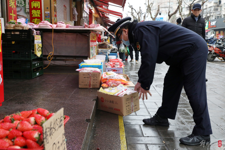 城管人员在街道巡回督查,协助维护好摊点外摆秩序。