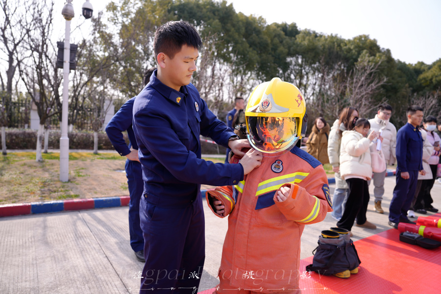 场内,消防志愿者为大家科普消防安全知识,讲解灭火器使用方法,带领小朋友们实地参观消防站,了解常用消防装备器材。在消防员的帮助下,孩子们体验了帐篷逃生、穿脱战斗服等,在寓教于乐中收获满满消防“知识技能包”。罗泾消防救援站还组织了升旗仪式,集体合唱《学习雷锋好榜样》歌曲。
