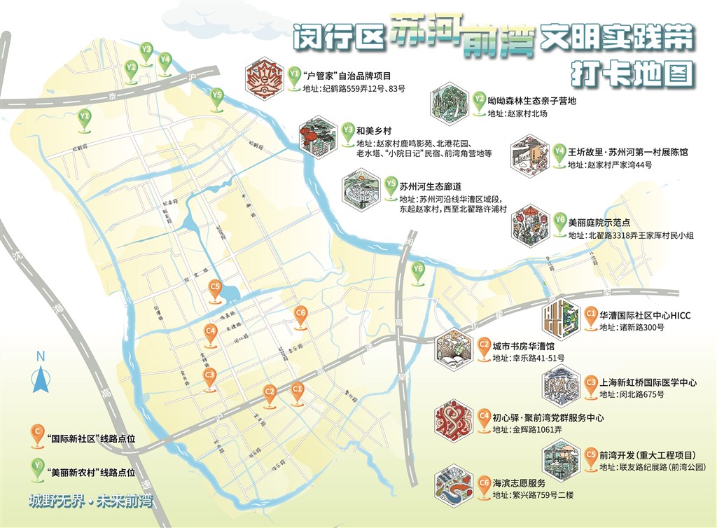 活动中,闵行区首个沿苏州河的文明实践品牌——苏河前湾文明实践带正式启动。以“城野无界”为主题,旨在打破城乡界限,实现城市与乡村的融合发展,蕴含了全面反映生态文明建设、美丽乡村成果、地方历史文脉传承等情况的“美丽新农村”线路,和以国际社区、虹桥前湾开发、模范人物志愿项目等为代表的“国际新社区”线路,打造出一条充满活力、多元共融的文明实践带。同时,华漕结合自身发展特点,推出以“苏河前湾红色文化宣讲”“小小河长”“HICC国际文化传播项目”等为代表的5大类12个文明实践重点项目。