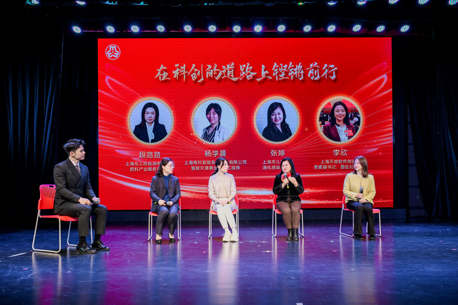 上海化工院检测有限公司肥料产业服务部部长段路路、上海电科智能系统股份有限公司智能交通事业部总工程师杨学晨、上海市儿童医院消化感染科主任张婷,以及上海天地软件创业园党委副书记、园区妇联主席李欣,从不同的工作领域出发,分享了巾帼建功的故事和感悟。