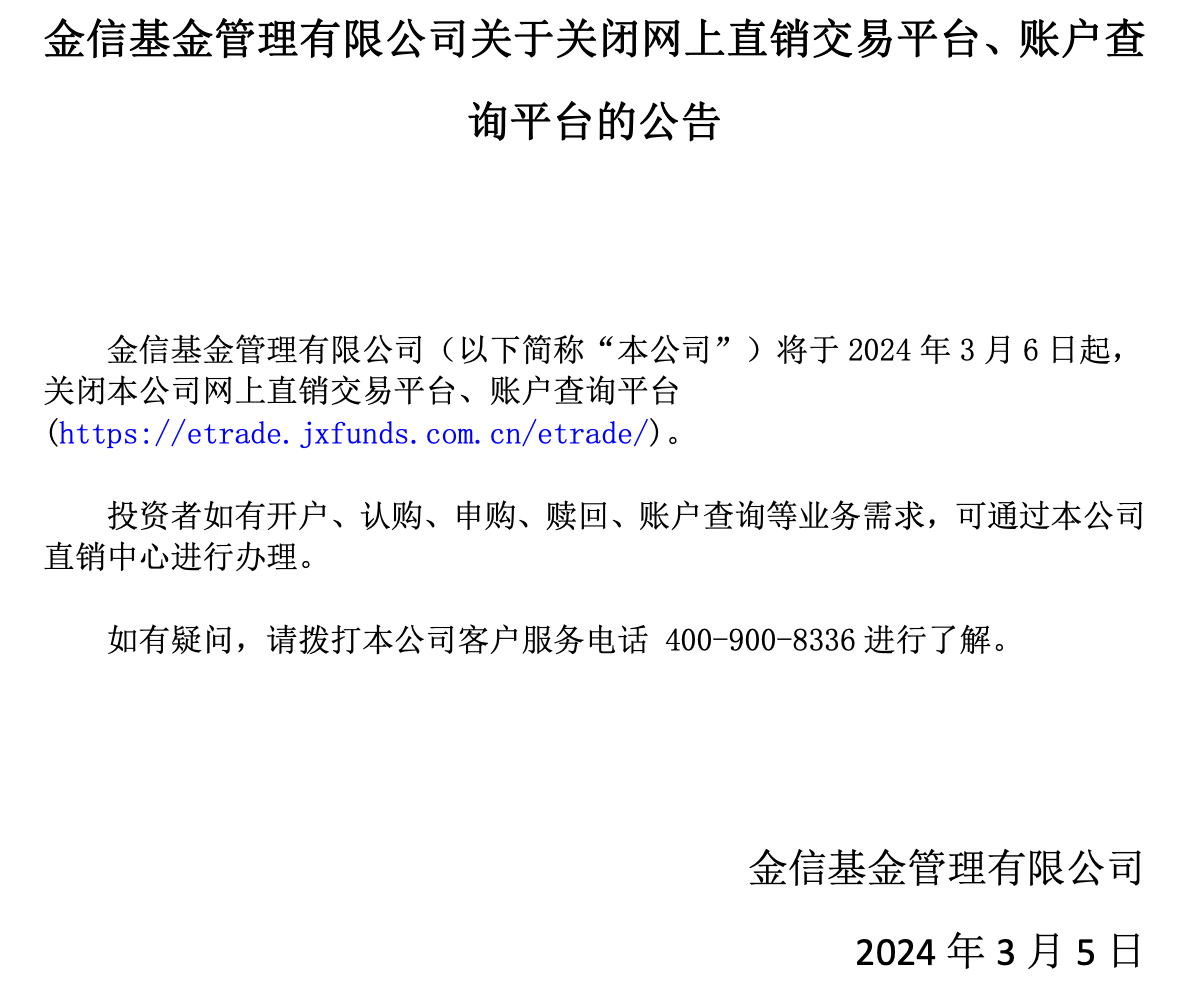 近日,金信基金发布公告称,自3月6日起,关闭公司网上直销交易平台、账户查询平台。投资者如有开户、认购、申购、赎回、账户查询等业务需求,可通过该公司直销中心进行办理。