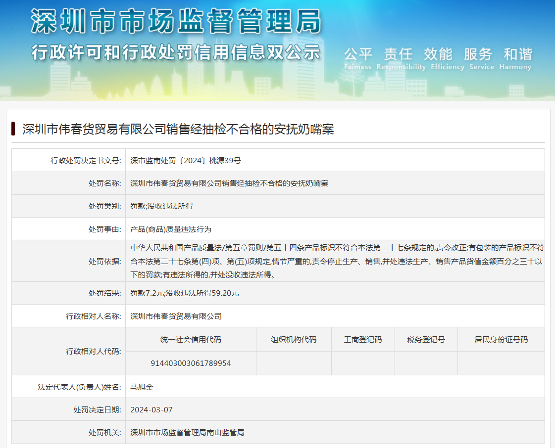 深圳市伟春货贸易有限公司销售经抽检不合格的安抚奶嘴案