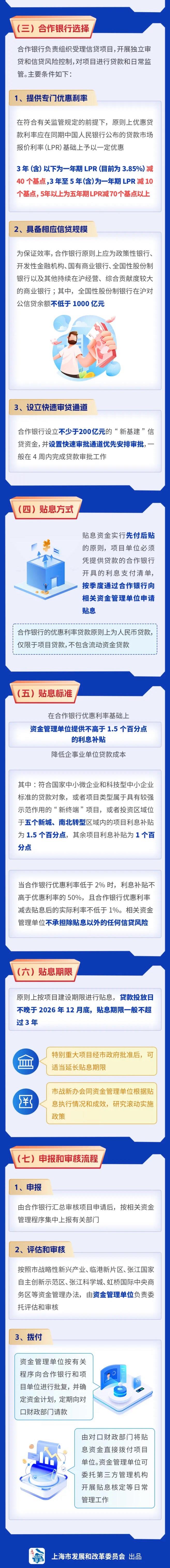 新版政策体现了贷款利率更低、贴息力度更大、申报条件更优、合作银行更多等特点。其中将“5年以上贷款利率不高于4%”调整为“5年以上贷款利率为五年期LPR减70个基点以上”。此外,五个新城、南北转型等重点区域内符合要求的项目均享受1.5个百分点的最高贴息补助,投资申报门槛则由1亿元调整为5000万元。
