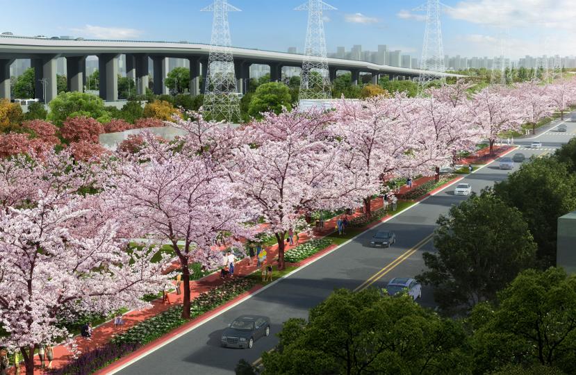 中环绿廊于2016年完成改建,整个绿地位于220千伏超高压线保护区范围,以防护功能为主,兼具生态及休憩功能。一条以樱花等四季花卉为特色、供市民漫步、健身、赏景于一体的林荫步道纵向贯穿南北,被周围居民亲切的称为“樱花大道”,中环绿廊的樱花集中在二三四期绿地,有早樱、染井吉野樱、晚樱等品种。由于最近气温和雨水的变化,今年中环绿廊的樱花相较于往年来说开花较晚,目前桂江路的早樱已经到达盛花期。