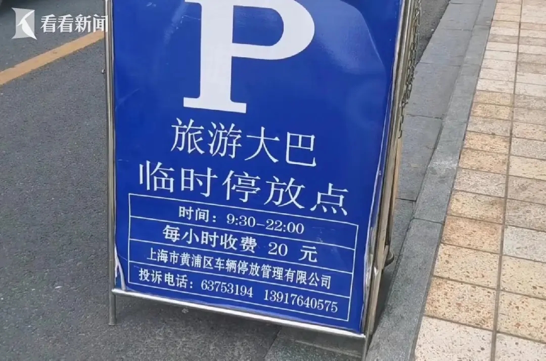 根据摆放在上街沿的指示牌,此处允许旅游大巴临时停靠,时间为每日9时30分至22时,每小时收费20元。但是,就在不远处的路牌标识却显示“停车行为违法”。