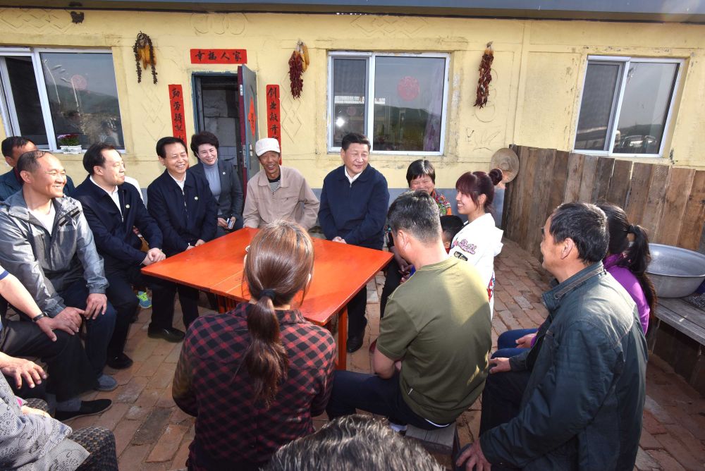 ↑2016年5月23日下午,习近平在伊春上甘岭林业局溪水经营所林场职工刘养顺(左五)家,同一家人和邻居们亲切交谈。