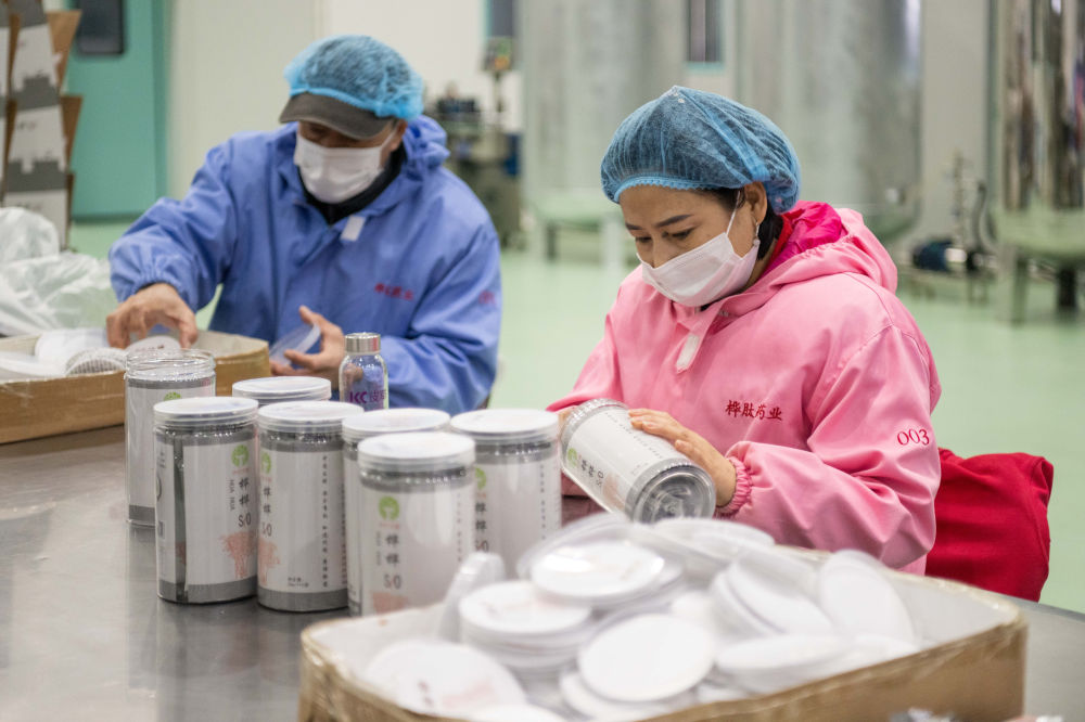 ↑2024年3月12日,在伊春桦肽生物药业有限公司,工作人员在包装桦树汁相关产品。2023年,伊春市桦树汁产业实现产值1.86亿元,同比增长147.44%,生物经济主营业务收入增长20.6%。