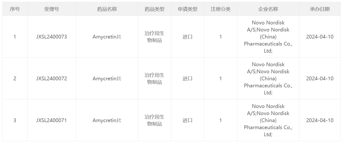 4月10日,中国国家药监局药品审评中心(CDE)官网公示,诺和诺德1类新药Amycretin片的临床试验申请获得受理,药品类型为治疗用生物制品。