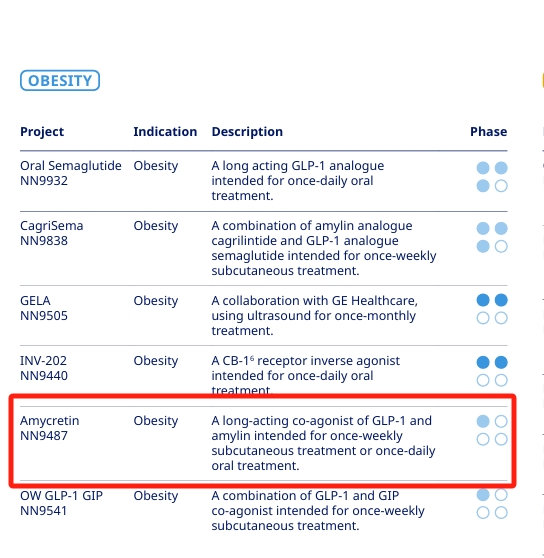 根据诺和诺德2023年年报,Amycretin是一款口服GLP-1受体和胰淀素受体的长效联合激动剂,处于一期临床研究阶段,在研适应证为肥胖,每周一次皮下治疗或每天一次口服治疗,其中口服Amycretin的一期临床试验成功完成。以此推测,诺和诺德在中国递交临床试验申请的是也极有可能是Amycretin的口服版本,不过这一信息并未有官方证实。