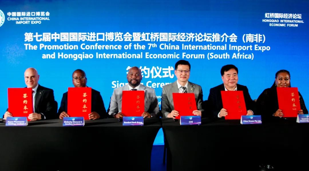 会上,进口博览局与标准银行集团、中国梦(南非)有限公司、金伯利钻石及珠宝孵化器、莎拉巴特曼大区市政府、爱施健制药公司签署参展合同或合作备忘录。