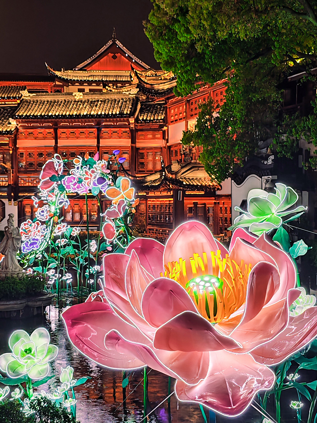 豫园九曲桥畔、湖心亭旁的百花装置亮灯场景 豫园商城 供图