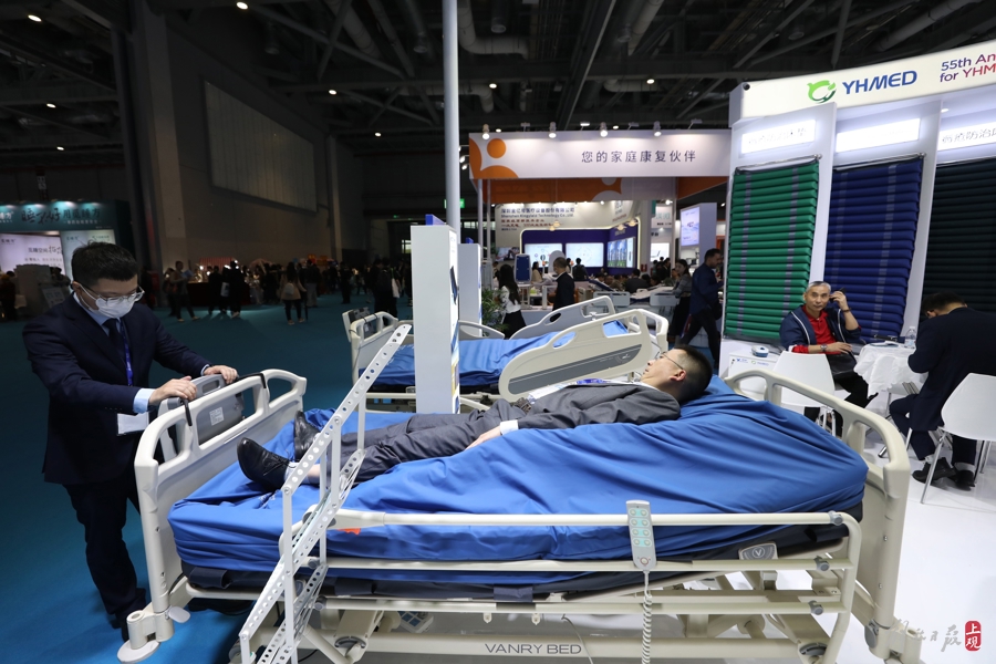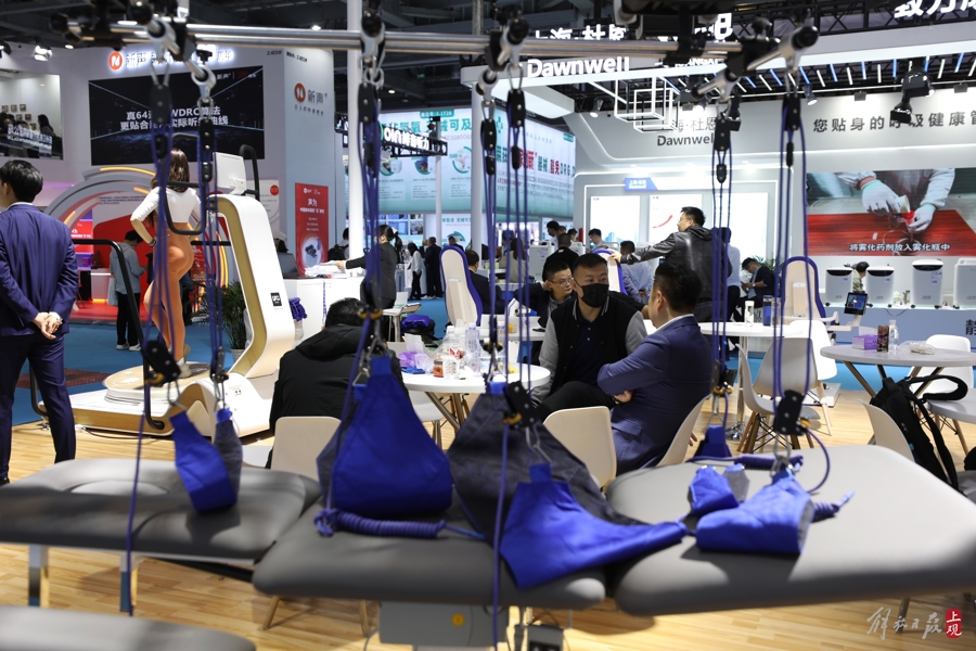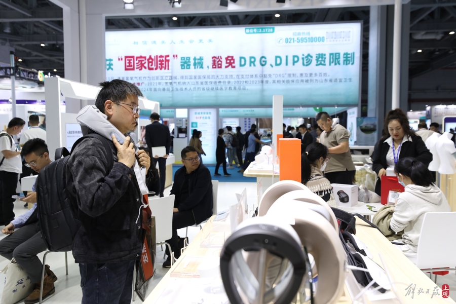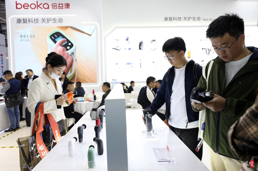 倍益康展区,观众在体验颈部按摩仪。这是一家以“康复科技,关护生命”为使命,专注于健康产品创新研发的高新技术企业。该公司拥有国内外专利500余项,产品覆盖电疗、力疗、热疗、氧疗、水疗等领域。