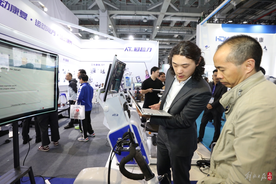 技术人员在展示一款运动康复诊疗系统。