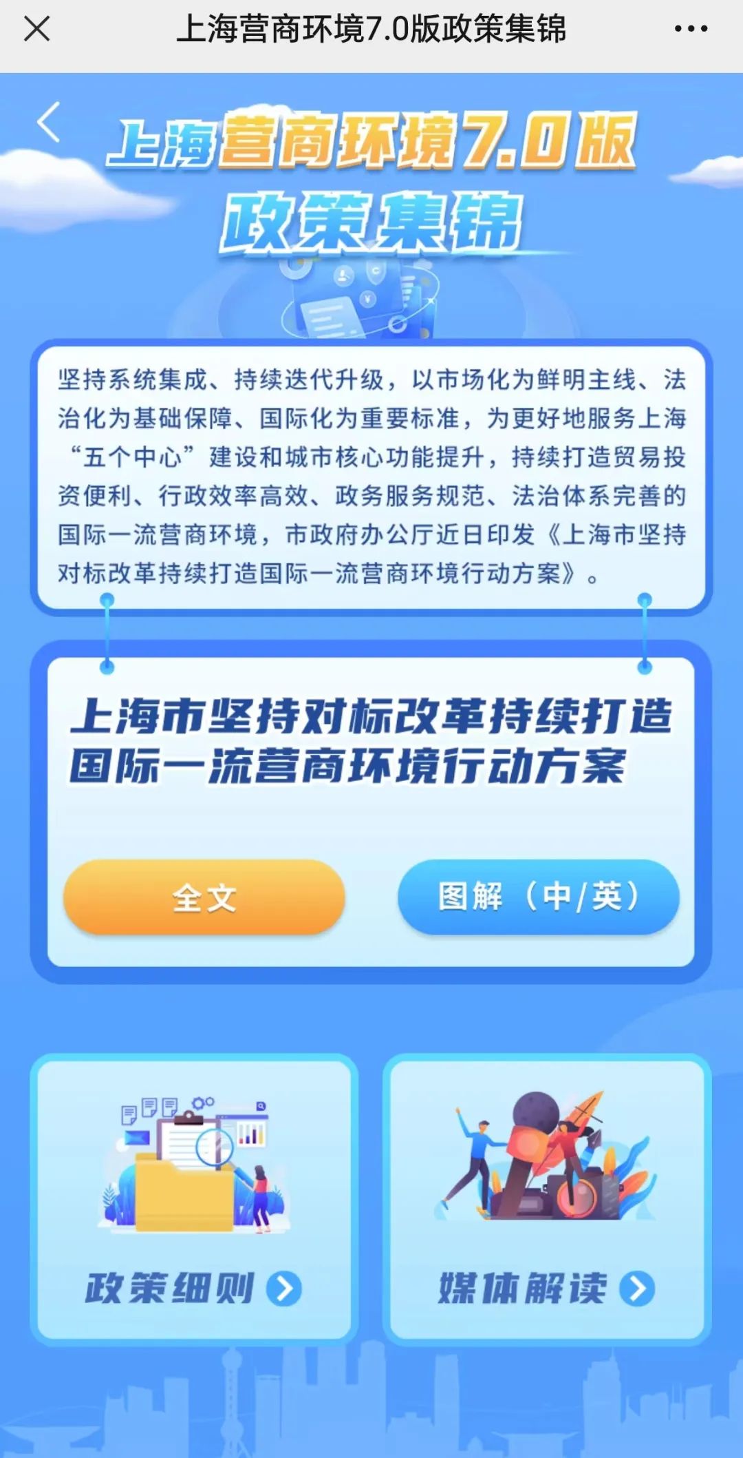 为方便大家全面了解,对相关内容进行了分类汇集整理,形成了《上海营商环境7.0版政策集锦》,即可在线快速查阅。后续,还将对相关政策进行收集整理并更新,详见↓