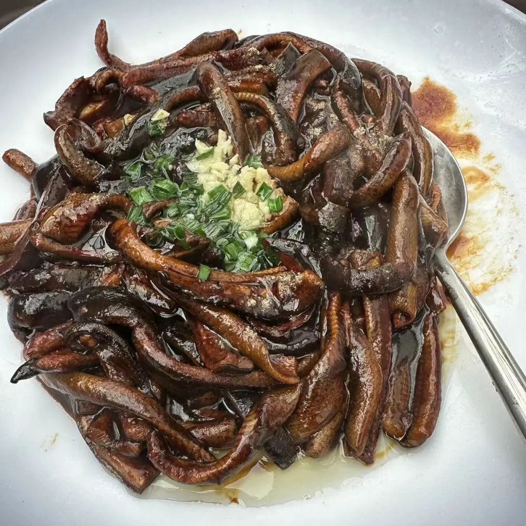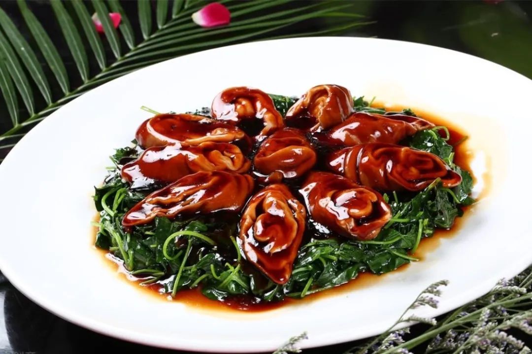 此菜色泽深红间绿,草吸油脂,肠浸清香,因此有肥而不腻,味道鲜美的口感。