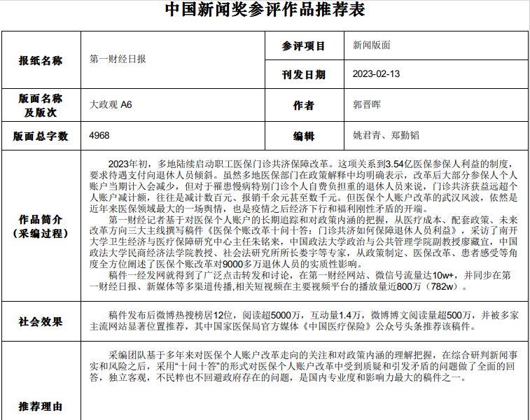 中国新闻奖参评作品推荐表(新闻版面)第一财经日报