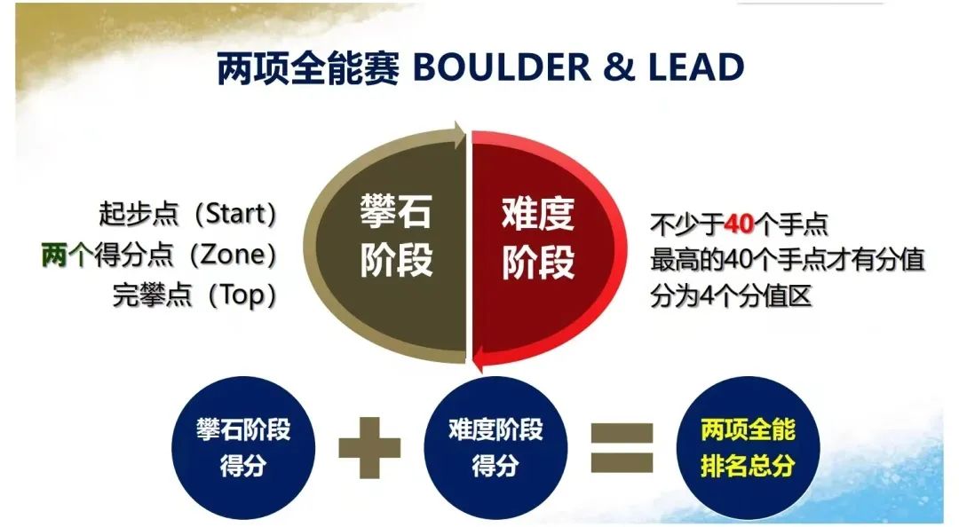 攀岩分为难度赛、攀石赛和速度赛。巴黎奥运会攀岩项目将在速度赛和两项全能赛(攀石+难度)上产生男子、女子各两块金牌。