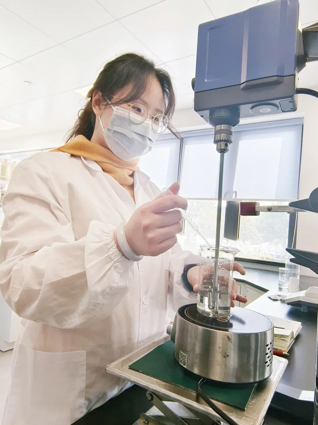 就这样,我开始慢慢地学,一点点地尝试,每次研发新产品前,做好各项资料调查,用数据做支撑,直到设计开发出最满意的配方。不过,这只是完成了第一步。每个配方打样后,我会反复实验配方的功效及稳定性,直到得到最完美的配比。上市前,会将中试实验品给同事们及家人朋友们试用,做“第一个吃螃蟹的人”,听一听大家的反馈。