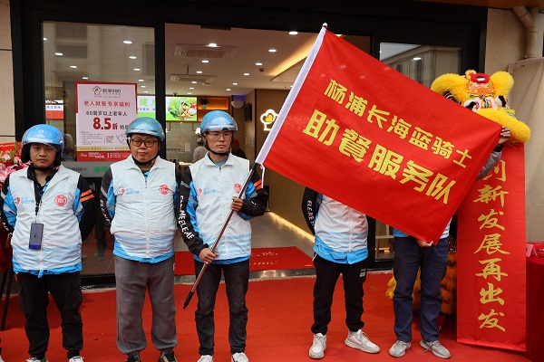 为提升老年人线上点餐的服务体验,饿了么专门优选党员骑手以及资深骑手组建了杨浦长海蓝骑士助餐服务队,他们也于当日被正式授旗,承担起确保社区食堂片区配送运力的使命。