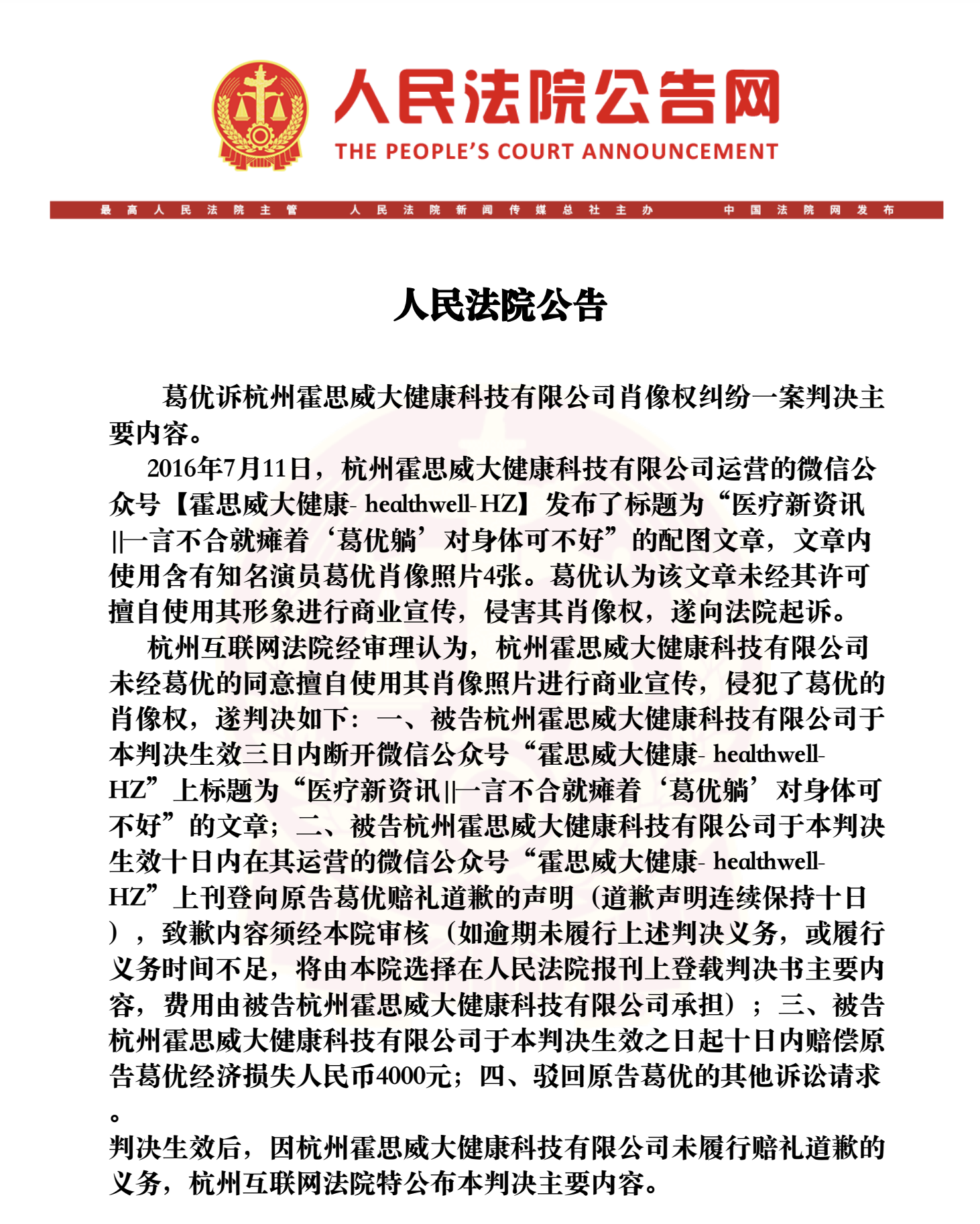 根据杭州互联网法院披露的判决,2016年7月11日,霍思威运营的微信公众号“霍思威大健康- healthwell-HZ”发布了标题为“医疗新资讯||一言不合就瘫着‘葛优躺’对身体可不好”的配图文章,文章内使用含有知名演员葛优肖像照片4张。葛优认为该文章未经其许可擅自使用其形象进行商业宣传,侵害其肖像权,遂向法院起诉。