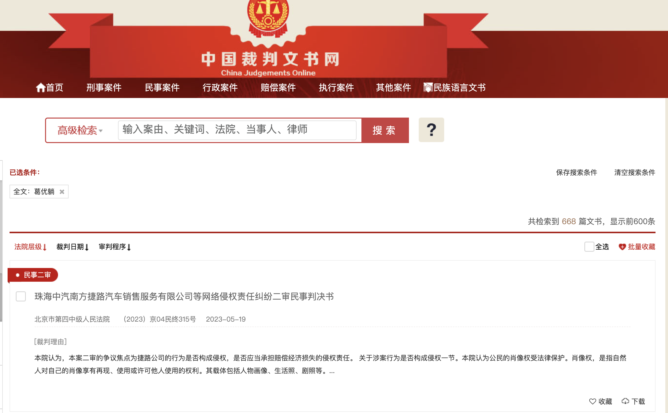 澎湃新闻注意到,在中国裁判文书网上,以“葛优躺”为关键字检索出668篇文书,且胜诉比例较高。根据2023年扬子晚报报道,截至2023年3月,“葛优躺”相关案件中,葛优方面胜诉率几乎是百分之百,大小赔偿金额合计约759万元。