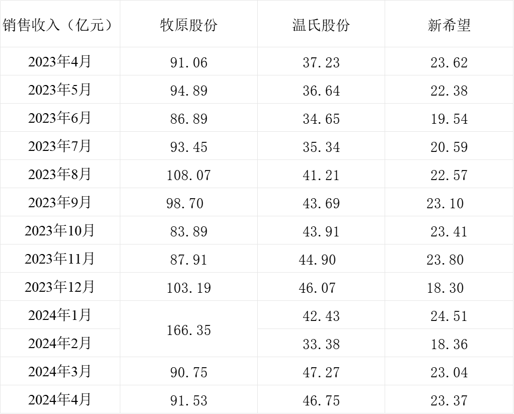 从销售收入来看,温氏股份同比有较大幅度增长,牧原股份和新希望环比同比变化不大。牧原股份和新希望环比均增长1%左右,牧原股份和温氏股份同比均增长,温氏股份增幅最大,为25.57%。