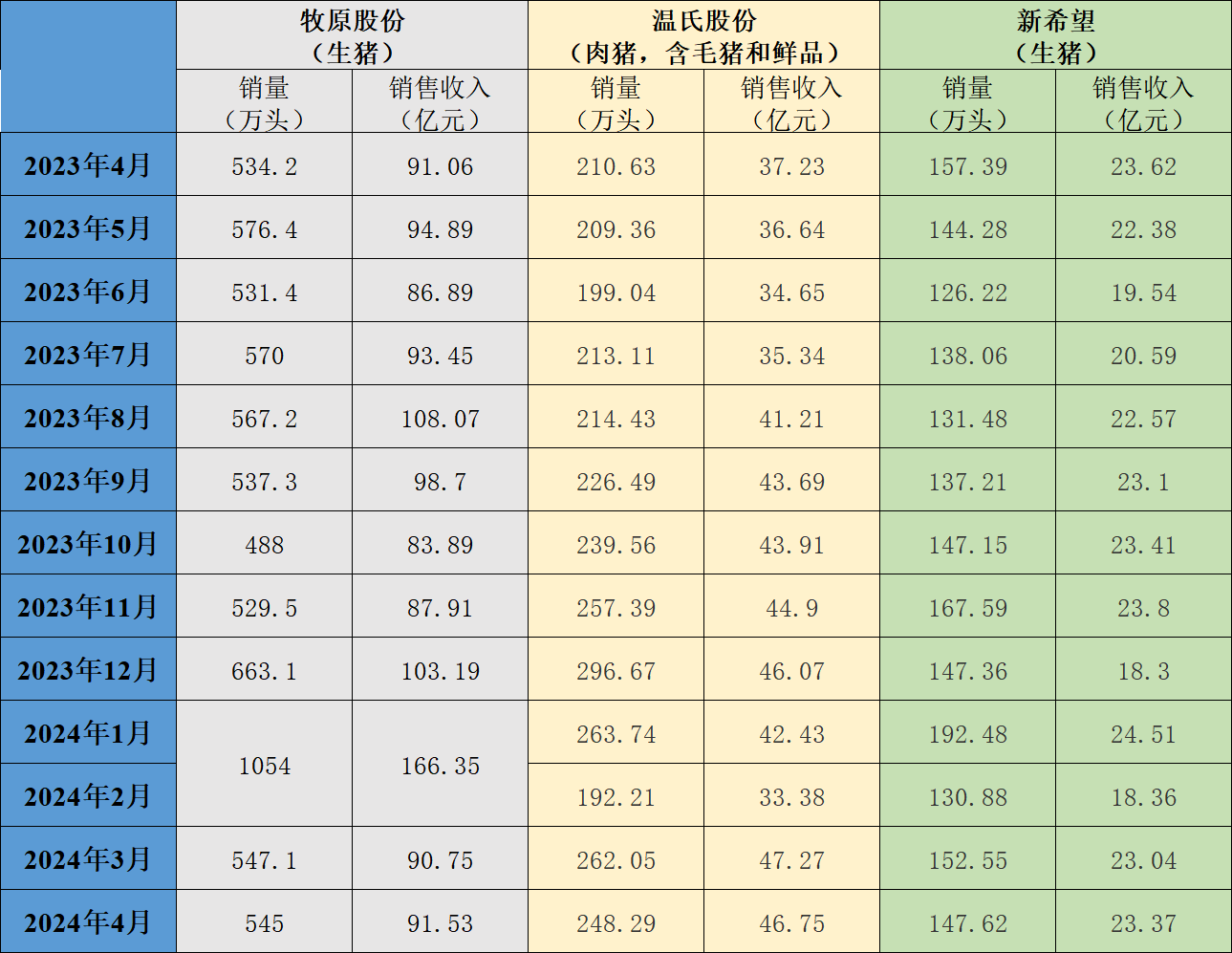 截至5月7日,三大上市猪企牧原股份(002714.SZ)、新希望(000876.SZ)、温氏股份(300498.SZ)全部发布4月生猪销售简报。