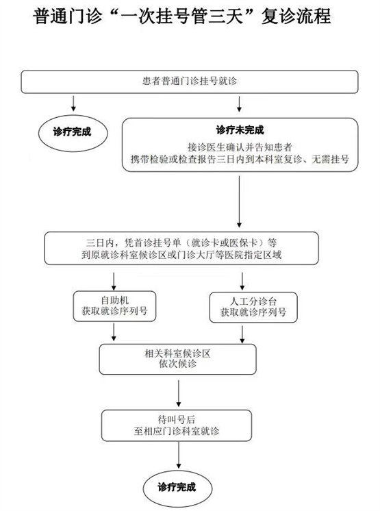 普通门诊“一次挂号管三天”具体是指患者到省内二级以上公立医疗机构(包括中医医院、妇幼保健院、儿童医院等)挂普通门诊号就诊时,如果因检验或检查当天不能完成或者不能获取报告,尚未完成诊疗,(含首诊当天)可携带报告结果到同一医院的同一院区、同一科室复诊,无需再次挂号,享受免缴普通门诊诊察费(挂号费)政策。比如,如患者在5月7日首次就诊,可于5月8日或9日报告出来后复诊,并享受相关政策。