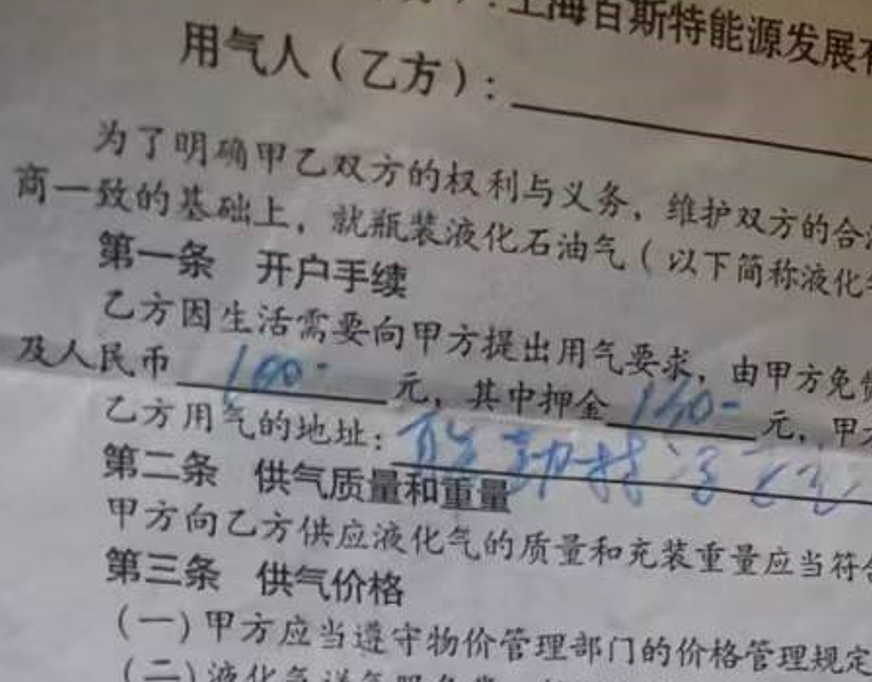刘先生租住在浦东新区北蔡镇联勤村冯家宅某号,使用喜威液化气罐已有多年。“最近几个月,液化气罐的配送一直有点问题,再加上我住的房子快要动迁了,所以我提出了退瓶。”刘先生租用的是1个钢瓶。他翻出2012年时的供用气合同,看到当时付过押金130元。