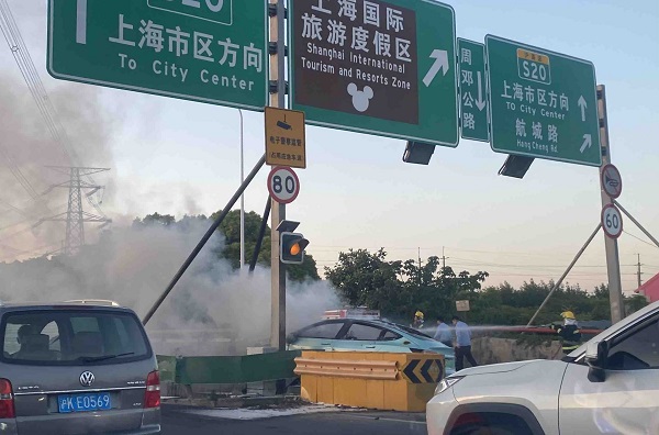交警、消防、医疗部门接报后先后赶到现场,先将受伤驾驶员转移至路边,同时快速扑灭现场明火。为配合现场救援,民警对该路段辅道采取临时管制措施,S2高速康桥收费站部分车道临时关闭。因事故处置时段正值下班高峰期,沪芦高速市区方向康桥收费站后方一度拥堵。
