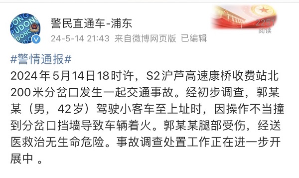 昨天19时40分左右,事故处置工作全部结束,事故车辆被牵离现场。21时43分,浦东公安分局官方微博发布警情通报。